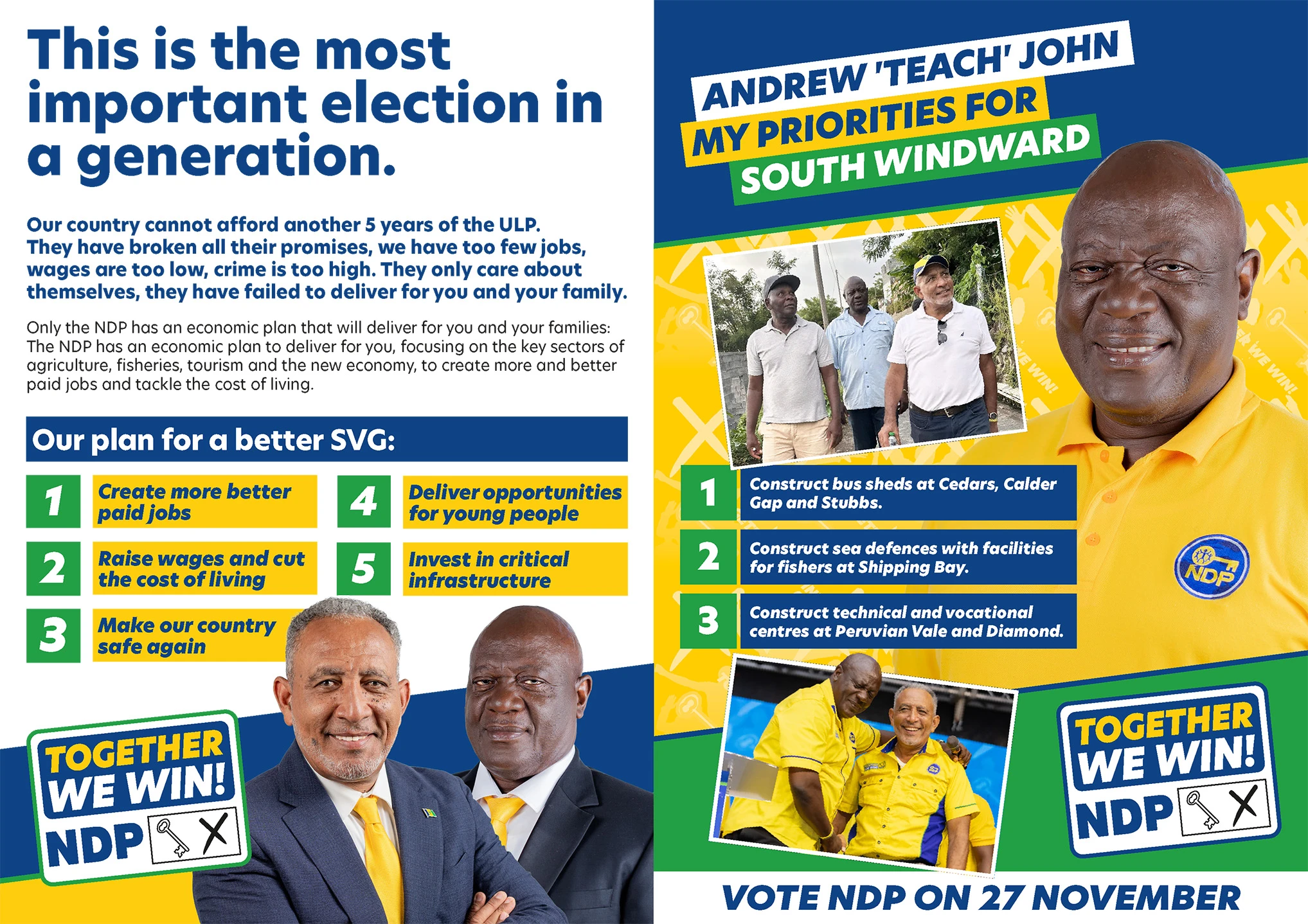Dr Friday’s NDP team is committed to getting SVG working.We will deliver new jobs, better healthcare, opportunities for young people, and reduce the cost of living.